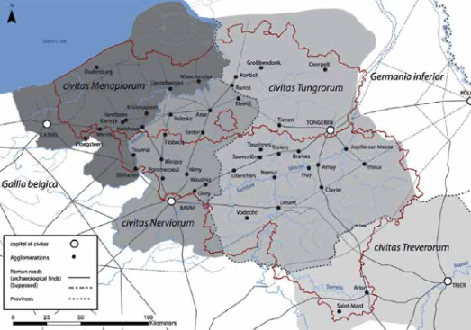 Het huidige België op een kaart van Romeinse regio’s in de 1e tot 3e eeuw n.C. (Bron: Apis - CRAN - Université catholique de Louvain)