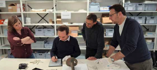Omdat beide auteurs grondige bedenkingen hadden bij de interpretatie en reconstructie van de fragmenten werd een beroep gedaan op de expertise van een aantal vakspecialisten. Op 9 april 2025 bezocht een Franse delegatie, bestaande uit professor Christophe Vendries4, archeometallurgist Benoît Mille en archeoloog Patrice Herbin, het erfgoeddepot Trezoor in Heule (Kortrijk) om de bronzen trompetonderdelen te bestuderen. De uitwisseling van informatie van de auteurs met deze Franse experts leverde verrassende inzichten op over de technische samenstelling en de interpretatie van het object. Er kon eenduidig vastgesteld worden dat het hier ging om afzonderlijke stukken van een lang, recht blaasinstrument: een Romeinse tuba.