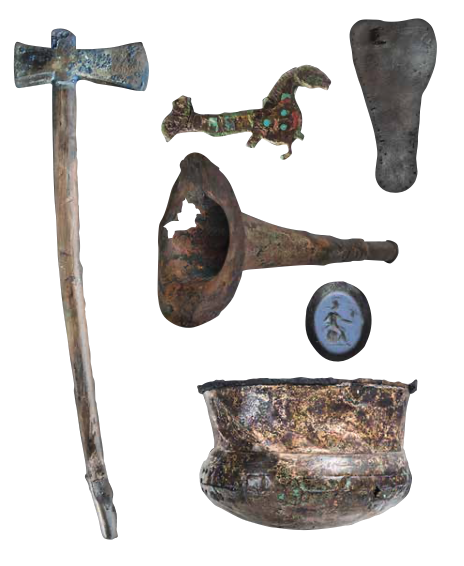 De meest opmerkelijke vondsten zijn onder andere een bronzen ketel, een intaglio (ringsteen) met een voorstelling van de godin Roma13, meerdere goed bewaarde lederen schoenen, een gouden ring, terra sigillata, een volledig intacte bijl, en tenslotte ook de tuba, die in dezelfde waterput (nummer 515) als de bronzen ketel werd gevonden.